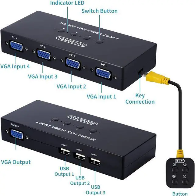 VGA USB KVM Switch - DGODRT 4 Port VGA KVM Switcher allows you to manage 4 computers or laptops with 1 monitor and 3 USB2.0 devices, such as keyboard, mouse, printer, scanner and hard drives.
