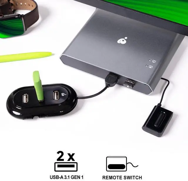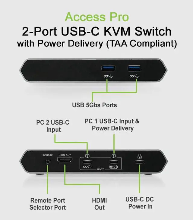 Easily switch between two USB-C devices and control them with one keyboard, one mouse and view content on one 4K monitor. IOGEAR's Access Pro 2-Port USB-C KVM Switch requires no software and comes complete with the Power Delivery function, USB-C cables, and a 6-foot push-button remote switch. Why spend extra money on features you don't need? The USB-C KVM offers the most efficient and affordable way to switch between two USB-C or Thunderbolt 3-equipped Macs, PCs, iPads, or Android tablets and smartphones with a single-cable connection to each device without additional drivers or software.