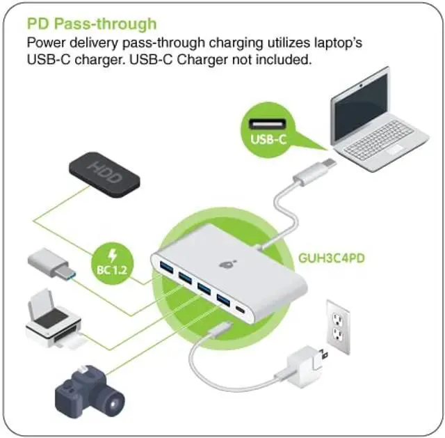 IOGEAR USB-C to 4-Port USB-A hub expands your laptop's USB-C port into 4 additional USB 3.0 Type-A ports. Connect your current USB devices like hard drives, flash drives, keyboards and mice, cameras, USB cables and other USB devices. IOGEAR hub also provides a USB-C port on the front of the hub allowing you to charge your mobile device or charge your laptop by connecting your manufacturers USB-C power supply. This hub is essential for laptops that provide only one USB-C port with no additional ports for peripherals. This super compact and lightweight hub easily fits into any laptop case, briefcase or backpack making it convenient to take with you on-the-go.