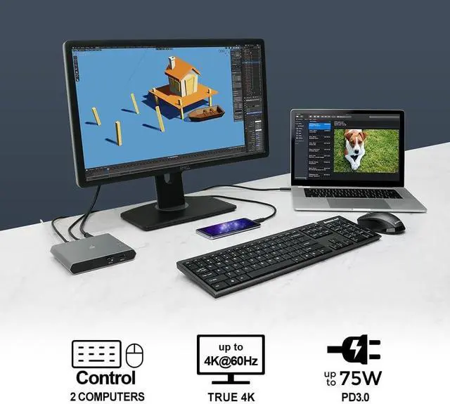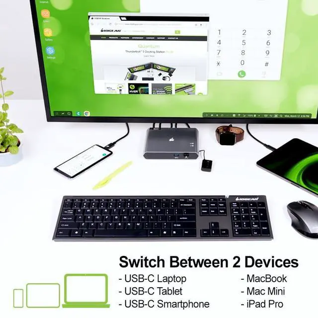 Easily switch between two USB-C devices and control them with one keyboard, one mouse and view content on one 4K monitor. IOGEAR's Access Pro 2-Port USB-C KVM Switch requires no software and comes complete with the Power Delivery function, USB-C cables, and a 6-foot push-button remote switch. Why spend extra money on features you don't need? The USB-C KVM offers the most efficient and affordable way to switch between two USB-C or Thunderbolt 3-equipped Macs, PCs, iPads, or Android tablets and smartphones with a single-cable connection to each device without additional drivers or software.