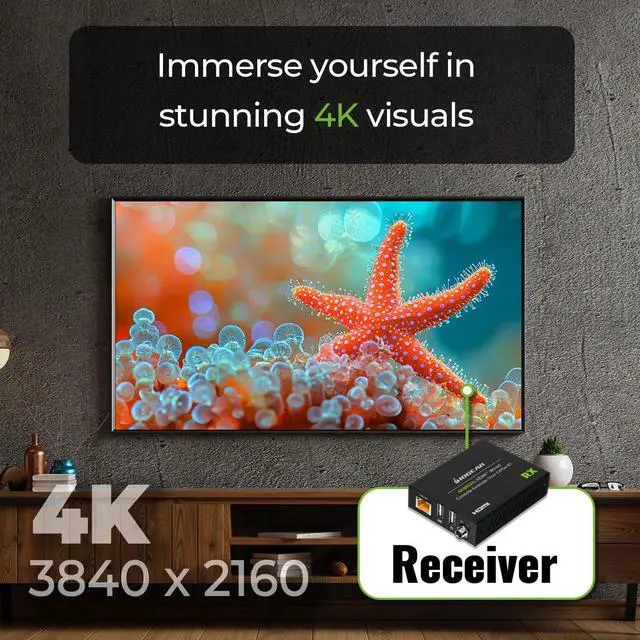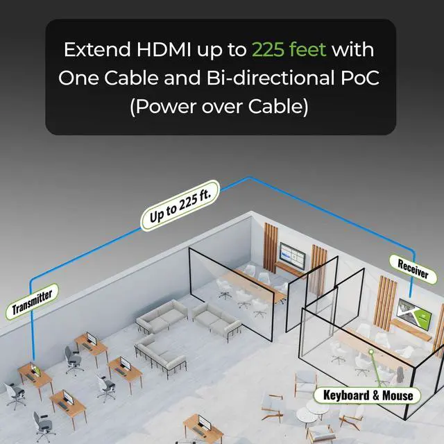 HDMI and USB keyboard/mouse over a single Cat5e/6/6A cable up to 225ft/70m ^^ Supports up to 4K@60Hz resolution (3840x2160@60Hz)