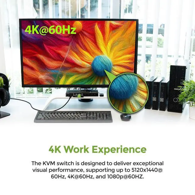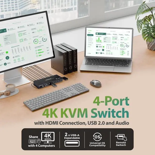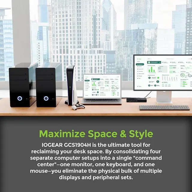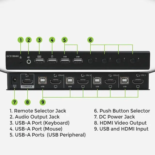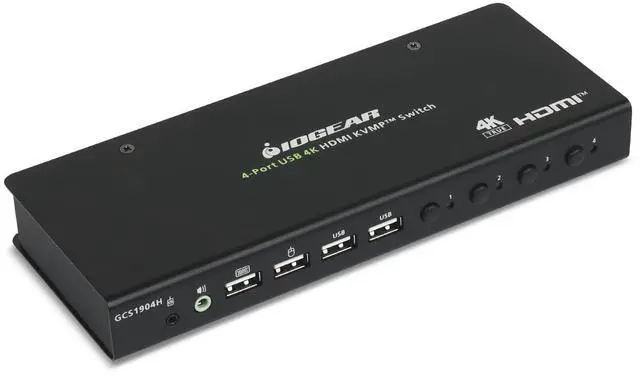 The GCS1904H 4-Port 4K KVMP Switch offers a powerful solution that streamlines your workspace. This device allows you to control up to four computers using just one USB keyboard, mouse, and HDMI monitor. It's designed to declutter your desk and simplify complex setups, making it a great choice for remote workstations, and office spaces.