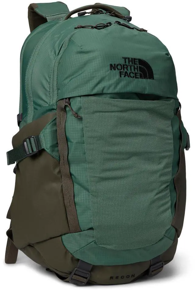 Carry all of your gear in The North Face Recon backpack. 360-degree reflectivity. Bottom compression. Padded top grab handle. Daisy-chain webbing offers lash points. External stretch-mesh pocket. External fleece-lined pocket. Front compartment has internal organization with secure-zip pockets and a padded tablet sleeve. Large main compartment. Protective dedicated laptop compartment. Removable waist belt. Side compression straps. Stand-up design for easy loading and unloading. Sternum strap with a whistle buckle. The FlexVent Suspension System is certified by the American Chiropractic Association; articulated shoulder straps, rounded back panel, comfortable stitch lines, and soft-touch chemise fabric.