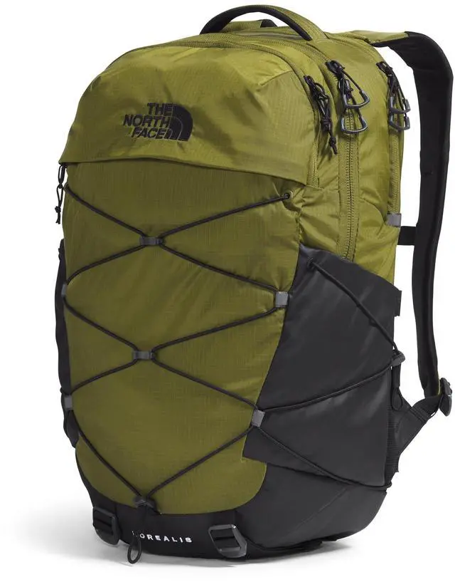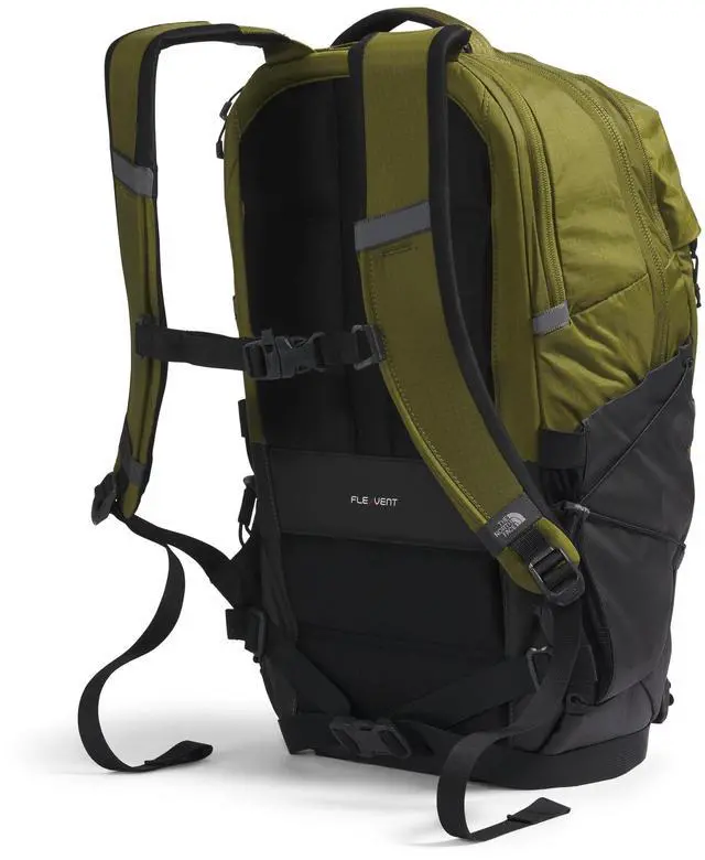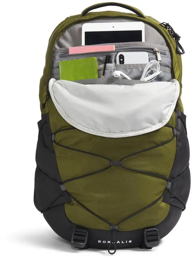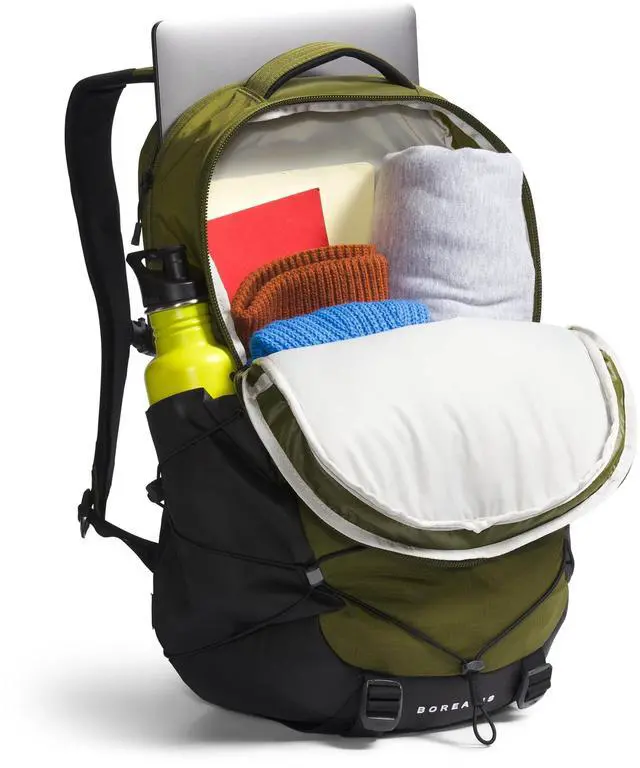 DescriptionBlaze your own trail and maximize on essential organization with The North Face Borealis back pack. Padded top handle design. Zippered closure. Padded, adjustable shoulder straps with sternum strap featuring a whistle buckle. FlexVent suspension system with articulated shoulder straps, a rounded back panel, comfortable stitch lines and soft-touch chemise fabric. Dedicated 18" laptop compartment. Computer compartment is designed to hold an iPad, Kindle or other similarly-sized tablets or e-readers. External bungee-compression system with clips offers more options for organization. Side bungee cords allow for more compression.