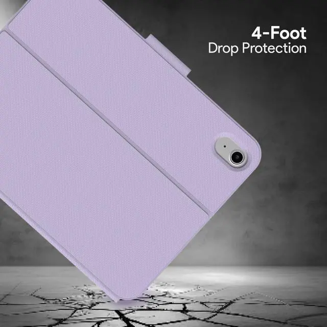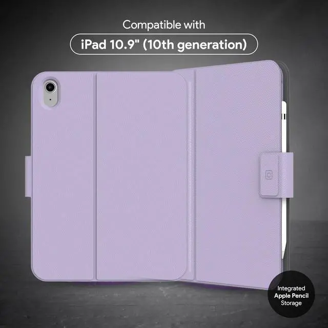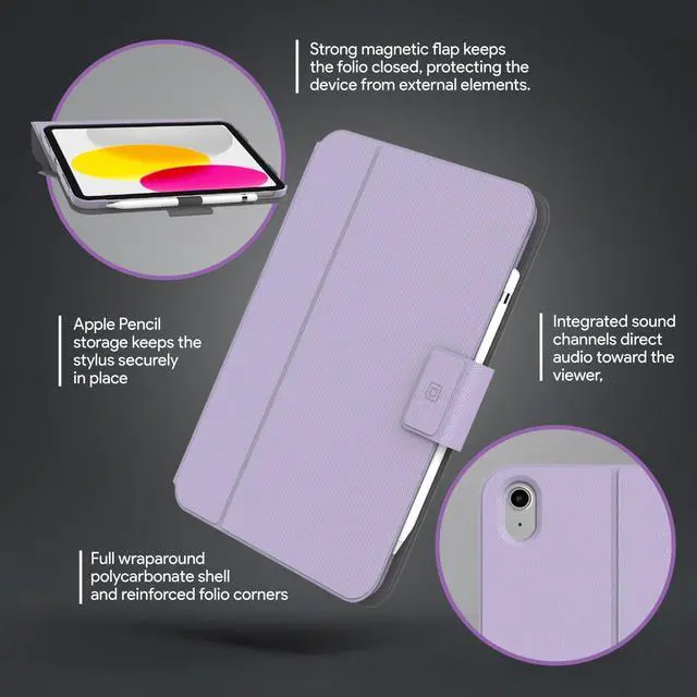 Experience enhanced protection and viewing versatility with this premium iPad folio case, designed to deliver both stability and functionality. The Magnetic View-Lock system features built-in magnetic notches that securely hold your device at four viewing angles ranging from 40 to 70, ensuring the perfect setup for watching movies, gaming, browsing, or working. Integrated Sound Channels redirect audio toward the viewer for a richer, more immersive sound experience. Built for durability, the case offers 4-foot drop protection with its full wraparound polycarbonate shell and reinforced folio corners. A secure magnetic closure keeps the folio firmly shut, protecting your device from dust and external elements, while sleep/wake functionality activates your screen automatically when opening or closing the cover.