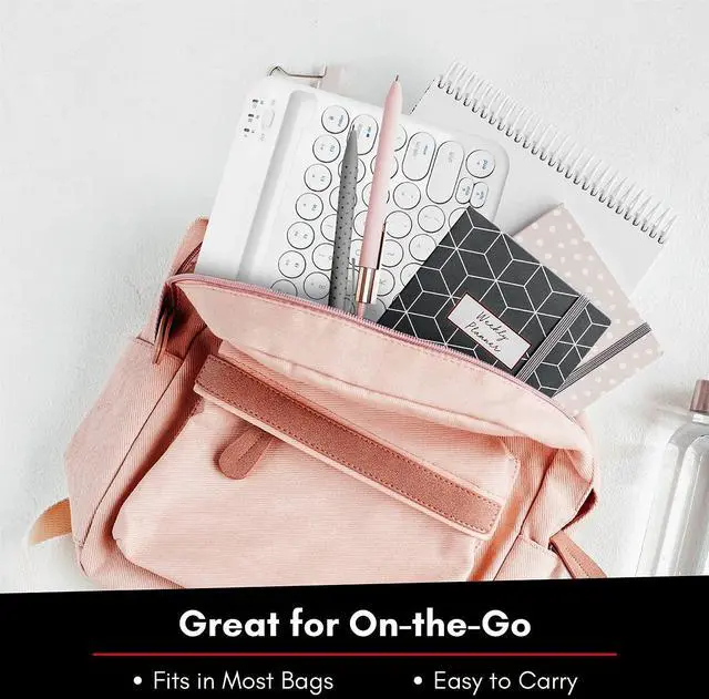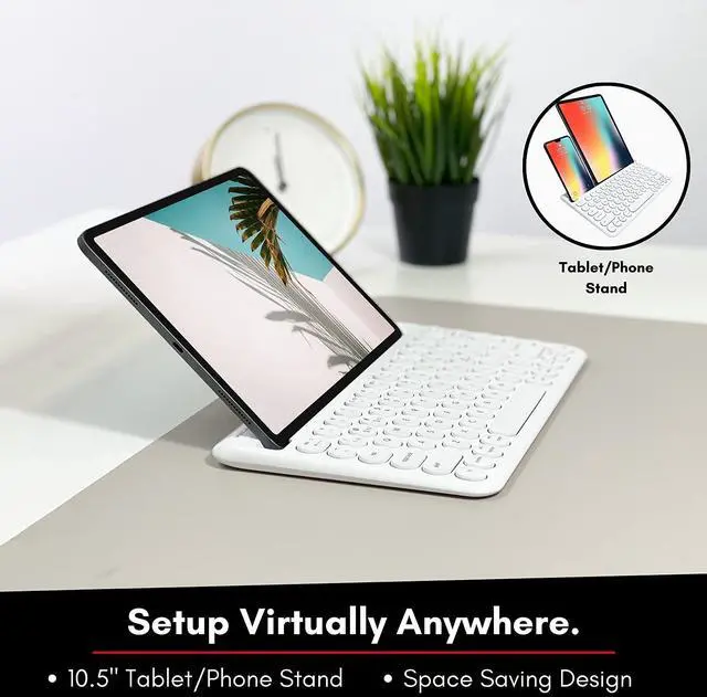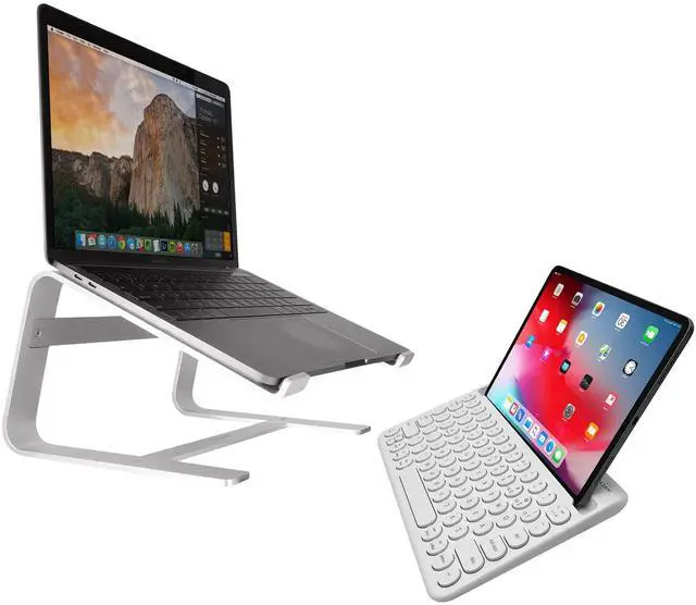 Includes an ultra compact keyboard that you can take virtually anywhere! Designed with a built-in tablet/phone mount. Comes with an aluminum ergonomic laptop stand that improves posture and cools down laptop. Designed at the ideal eye level angle, prevents hunching over your laptop screen.