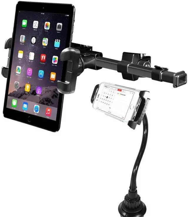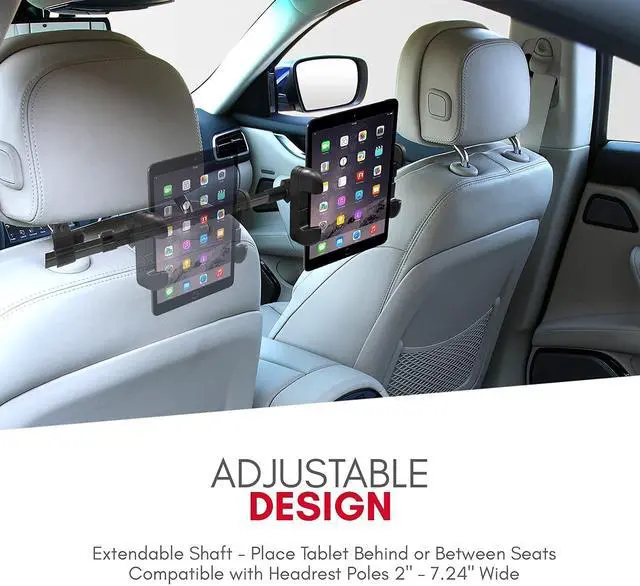 Includes a headrest tablet holder that stretches up to 10" wide, designed with a 360 rotatable swivel ball for your desired viewing angle. Features a cup holder tablet mount with a 360 rotatable swivel ball, expands up to 12"