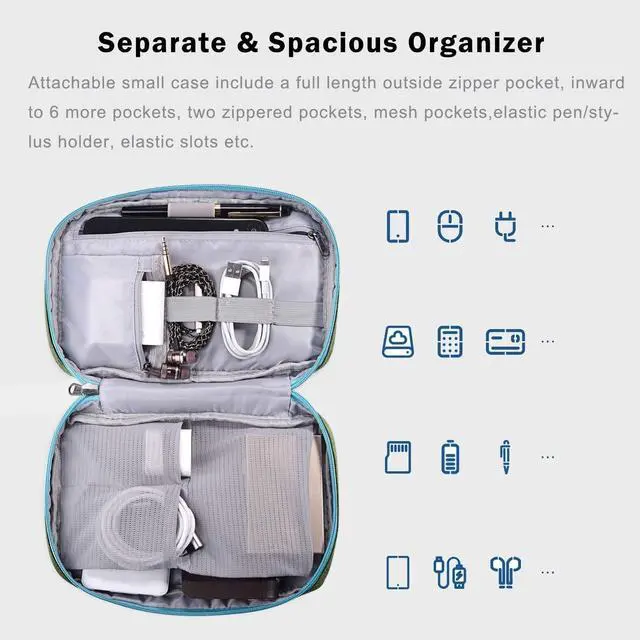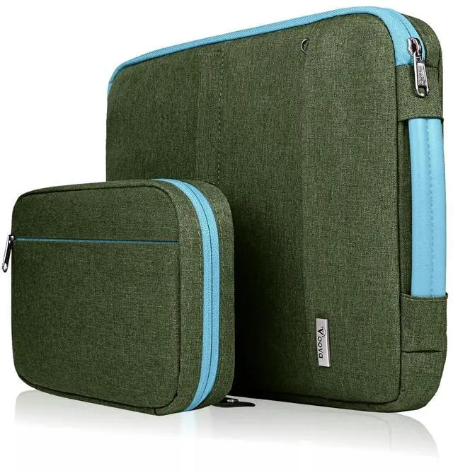 Smart Add-on BagSpecially, this stylish laptop sleeve has a detachable small accessory pouch include 8 more pockets, two zippered pockets, mesh pockets, elastic pen/stylus holder, elastic slots etc. It is great to hold a lot more than just charger and fits everything perfectly without crowding the laptop and its protection. Also the bonus bag can be zipped up and button down to attach or remove easily. (it zips and there are two snap buttons at the bottom of the sleeve). ^^ Practical & Attractive Laptop cover adopted premium PU/leather handle, it makes you easier and comfortable to carrying for a long time even load heavy computer/essential, very substantial.