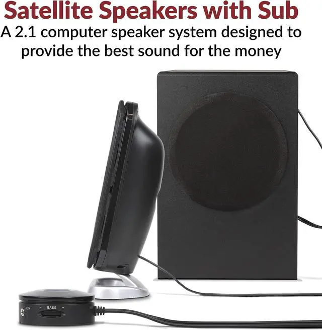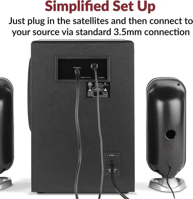 The pod also houses a convenient headphone jack and auxiliary input for easy connection to all your devices. Use with iPods, MP3 players, DVD players, smartphones, tablets, laptops/notebooks, computers, game consoles and even entertainment systems. The CA-3810 is an ideal speaker system for gamers and movie watchers. The subwoofer will blast you out of your seat, and the finely tuned satellite speakers keep everything even and crisp. AC power 110V only.