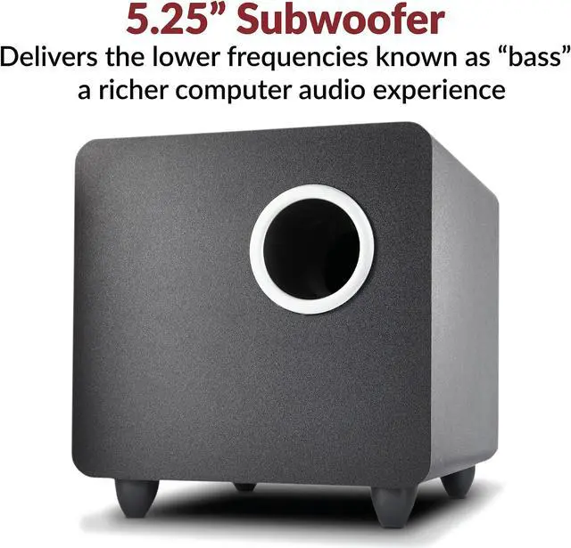 High-quality audio 2.1 speakers with subwoofer deliver 62W peak power and 30W RMS. Each satellite features dual 2-inch titanium drivers that deliver crisp highs and warm mid-tones while the 5.25-inch down-firing subwoofer with tuned port puts out deep, powerful bass, for excellent sounding music, movies, or games.