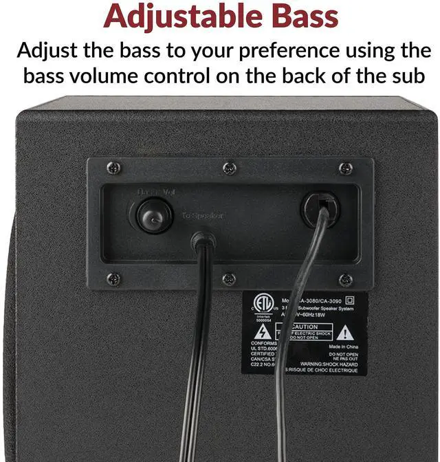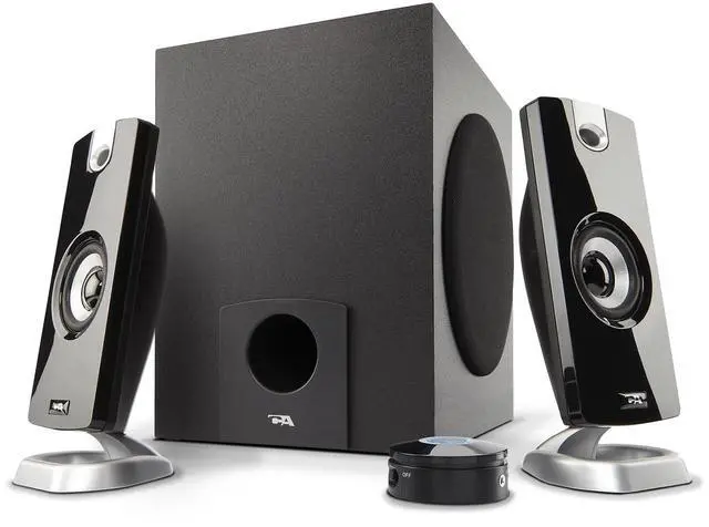 Includes CA 3090 2.1 speakers with subwoofer, 110V AC power adapter, and user guide; includes one year manufacturer warranty