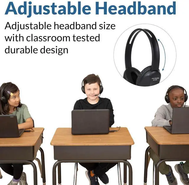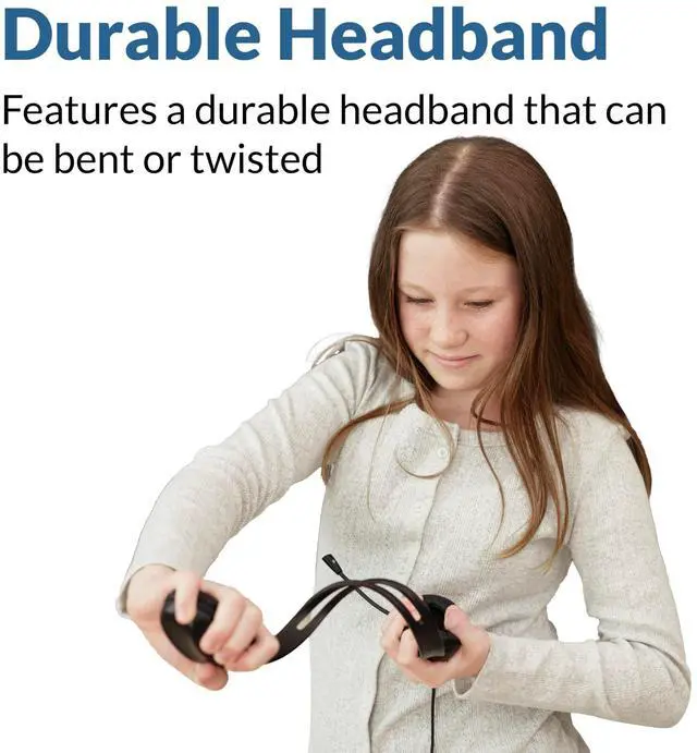 ^^ COMFORTABLE FIT: The adjustable headband and cushioned leatherette earpads provide a comfortable, secure fit for all ages and head sizes. Ideal for extended online meetings, learning sessions, or customer service calls.