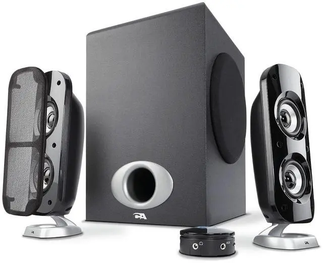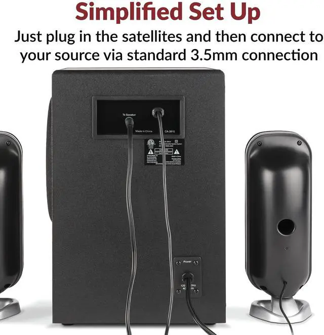 The compact subwoofer fits under most desks and in smaller spaces. ^^ Includes CA-3810 2.1 speakers with subwoofer 110V AC power adapter, and user guide. Includes 1 year manufacturer warranty. Our US based customer service team is here to help. Contact us through.