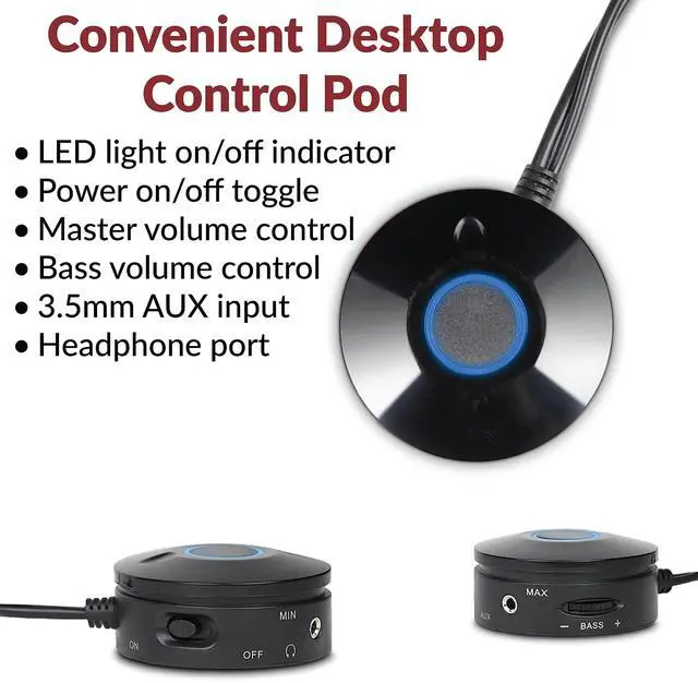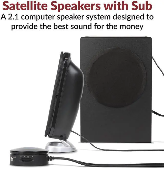 Room filling sound - 2.1 speakers with subwoofer deliver 80W peak power and 40W RMS. Enjoy music, movies, and games with crisp highs, warm mid-tones and deep, powerful bass from the ported 5.25 side-firing subwoofer and dual 2 satellite drivers. For the best sound fidelity, we recommend setting the volume on the source (computer, tablet, etc. ) between 65-80% and then use the volume controls on the speaker system to raise and lower the volume. ^^ Convenient control pod Adjust volume or bass levels to customize your sound just the way you want it.