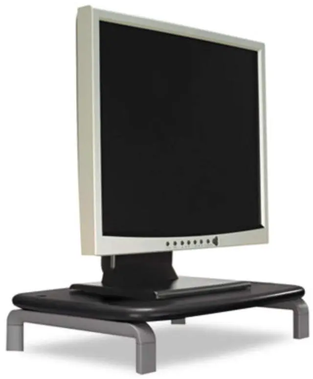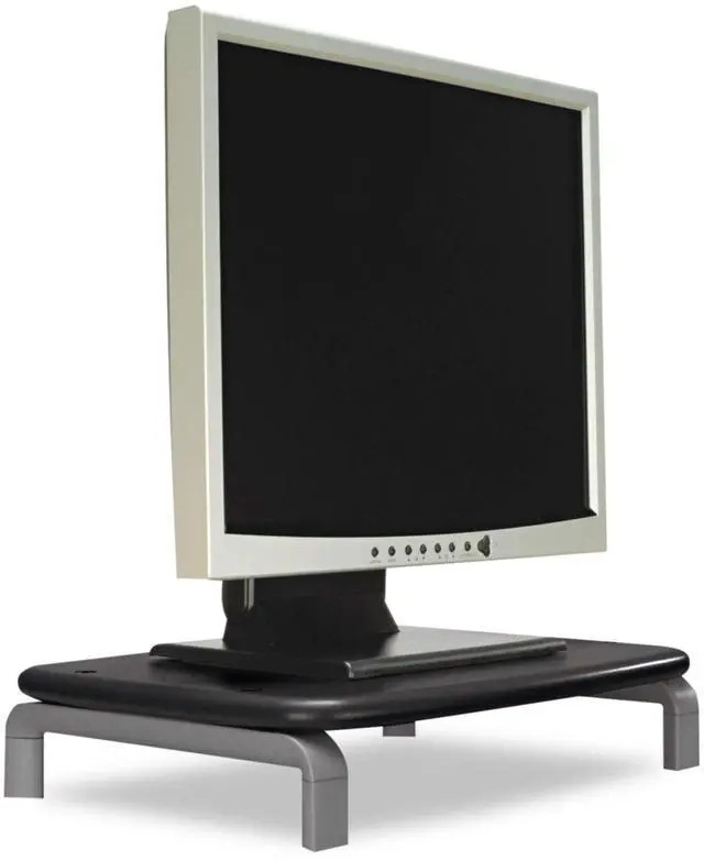 Adjusts monitor height without tools to an optimal viewing angle, helping to reduce eye and neck strain and fatigue. Expands usable desk space by allowing storage underneath platform. Large platform supports any monitor up to 21" and 80 lbs.