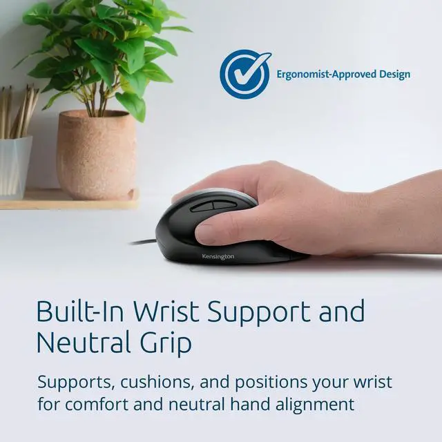 The ergonomist-approved Pro fit Ergo wired Mouse positions your hand for improved comfort A built-in wrist support and neutral grip supports cushions and positions the wrist for comfort and neutral hand alignment Quiet clicking makes for smooth and non-disruptive operation Its plug & Play USB connection is simple and reliable Five buttons (including forward and back) enhance navigation and productivity And four DPI settings (1000/1600/2400/3200) let you dial in the sensitivity and precision of your mouse cursor