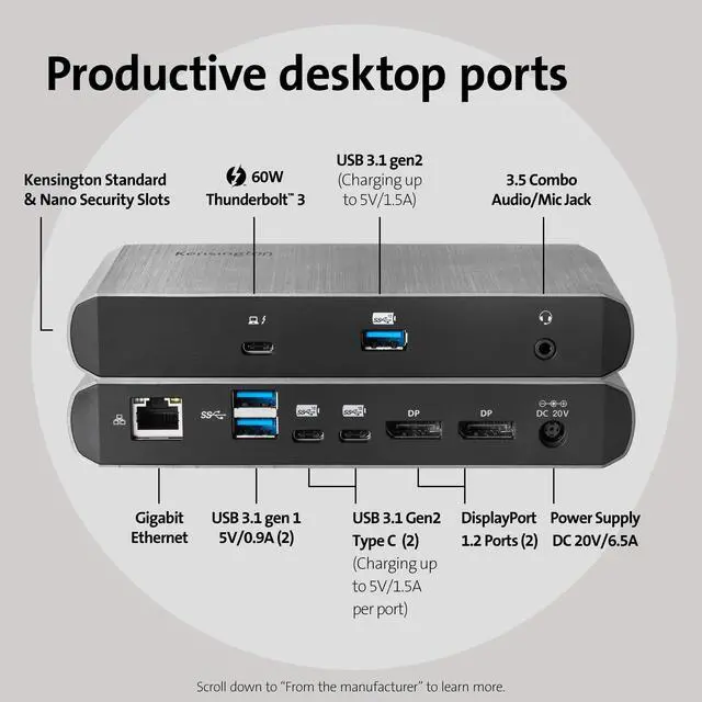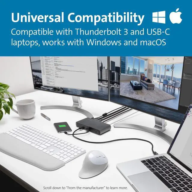 At last, the perfect dock for maximum productivity and compatibility has arrived. Innovatively engineered to support mixed computing environments with high transfer speed requirements, the Kensington SD5550T Thunderbolt 3 and USB-C Dual 4K Docking Station plugs into the power of one one dock for more power, more bandwidth, and more compatibility. Optimize your productivity with one of the first docks to deliver the unrivaled transfer speeds of Thunderbolt 3 (up to 40Gbps) while also supporting USB-C laptops (up to 10Gbps). Ideal for hot-desking, 4K workspaces, video editing, graphic design, or content creation, the SD5550T provides more speed, more pixels, more power, and more possibilities.