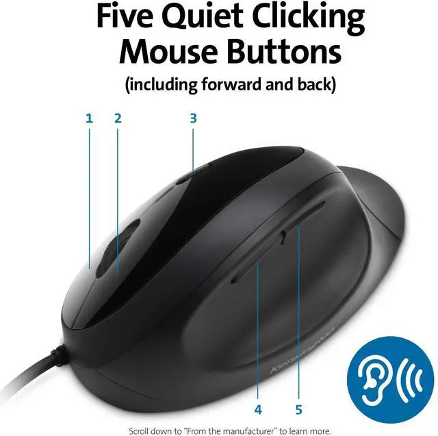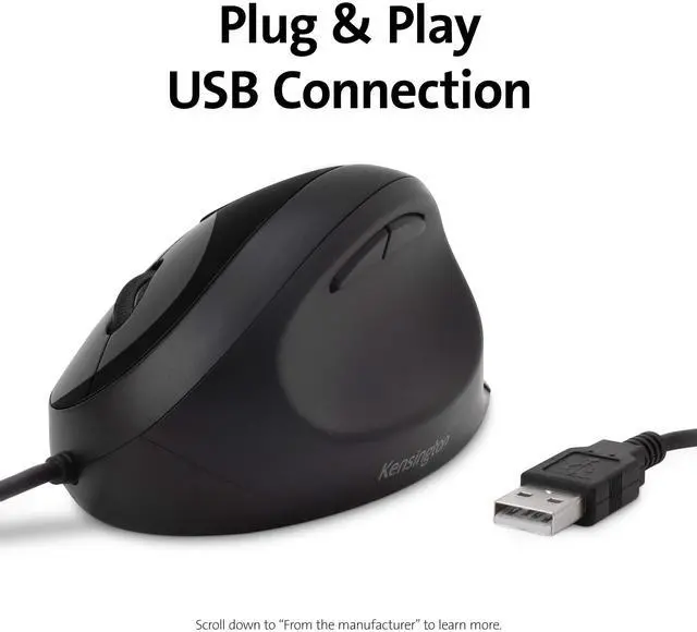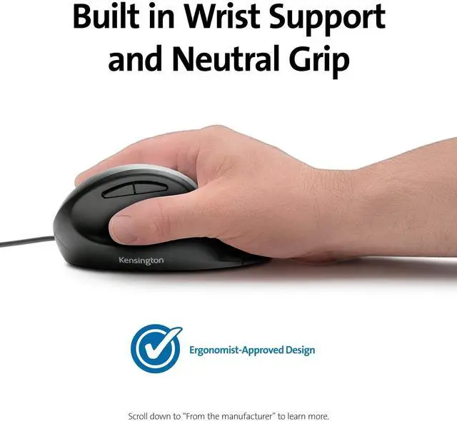 The ergonomist-approved Pro fit Ergo wired Mouse positions your hand for improved comfort A built-in wrist support and neutral grip supports cushions and positions the wrist for comfort and neutral hand alignment Quiet clicking makes for smooth and non-disruptive operation Its plug & Play USB connection is simple and reliable Five buttons (including forward and back) enhance navigation and productivity And four DPI settings (1000/1600/2400/3200) let you dial in the sensitivity and precision of your mouse cursor