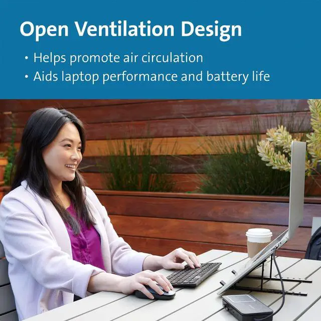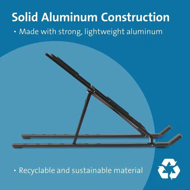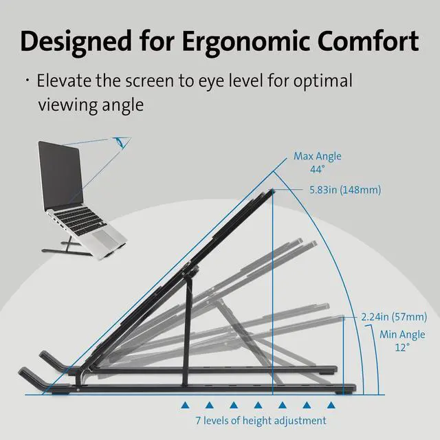 As laptops have moved from conference room and coffeeshop to the home office, users need a way to easily integratetheir laptop into their desktop environment. KensingtonCollapsible Aluminum Laptop Riser is the lightweight, portable laptop stand for those seeking to match ergonomiccomfort with enhanced productivity. Constructed of durable, sustainable aluminum, the smart, minimalist designsupports virtually any size laptop up to 16, letting youchoose from 7 levels of height/angle adjustment to elevatethe screen to eye level for optimal viewing. Features openventilation for laptop cooling and quickly folds flat for grab-and-go travel.