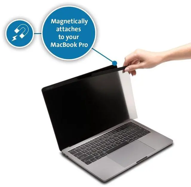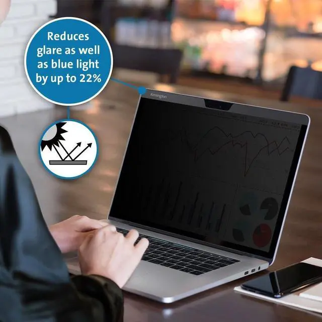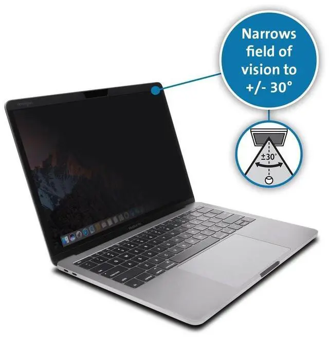 Trust Kensington, the choice of IT professionals, to help protect the information on your MacBook to reduce the chances of wandering eyes viewing confidential data on your screen. MP Series Laptop Privacy Screens limit the field of vision to +/- 30 degrees so a person off to the side only sees a dark screen. The reversible privacy screens also use low reflective coating to reduce glare, and they filter out harmful blue light by up to 22 percent.