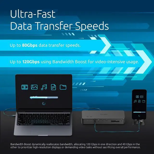 Professionals using MacBook M-Series models with Pro and Max chips need a docking station that supports the maximum capabilities of their investment and enhances workflow efficiency. The EQ Pro Thunderbolt 5 Dock Designed for MacBook delivers. Unique features include a built-in and patent-pending lockable PCle M. 2 SSD slot for quick storage expansion, triple CF/SD/Micro SD card readers, and patent-pending iPhone Photo Backup and Focus Mode buttons, making it ideal for creative professionals and content creators. This single-cable solution delivers up to 140W power to the MacBook and connected accessories, supports up to two 6K displays, and delivers 80Gbps bi-directional bandwidth.