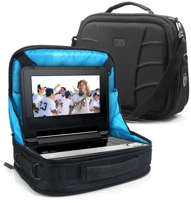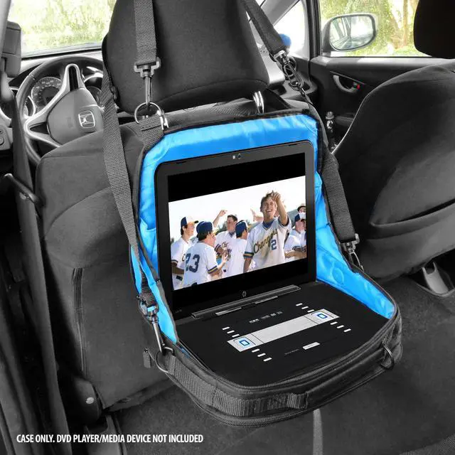 2-IN-1 PORTABLE DVD PLAYER CASE AND HEADREST HOLDER Carrying case & car mount for portable DVD & Blu-ray players up to 11.5 x 10 x 2.75 inches big (screen size must be between 7" and 10" big) ^^ PLENTY ROOM FOR ACCESSORIES Built-in compartments keep power cords, headphones, AV cables, or second screens organized in a portable bag size that beats the limited storage of hard travel cases ^^ CARRYING STRAP INCLUDED The detachable strap allows optional shoulder carrying for hands-free travel convenience, which many case alternatives completely overlook and do not include ^^ CAR SEAT HEADREST MOUNTING Securely fasten to your car's seat for enjoyable viewing for one, or hang between two seats for comfortable shared viewing among multiple riders during long road trips ^^