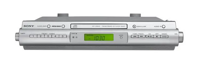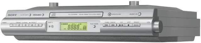 Designed to maximize your counter space and blend with virtually any decor, this under cabinet CD clock radio is the perfect addition to any kitchen. Boasting deep bass and powerful sound quality, this unit lets you enjoy your favorite tunes while you cook, clean, or just relax with a cup of coffee. The built-in audio cable lets you connect your digital music player, while the CD player accepts burned CD-R or RWs. An AM or FM radio is also included with 15 preset stations. For the ultimate convenience, a remote control is included for changing tracks, radio stations, adjusting volume and more.