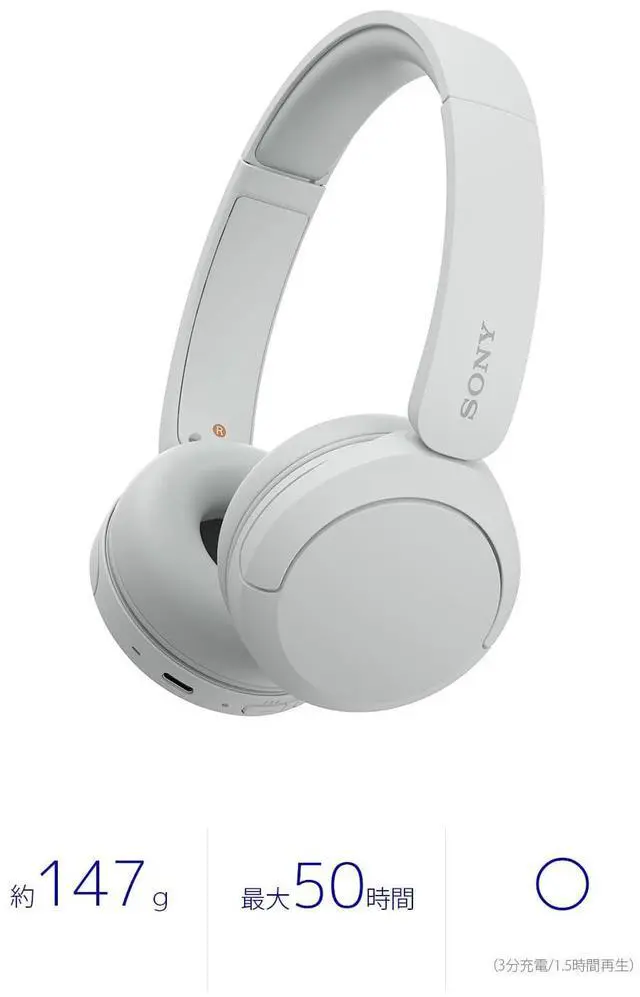 Sony WH-CH520 Best Wireless Bluetooth On-Ear Headphones with Microphone for Calls and Voice Control, Up to 50 Hours Battery Life with Quick Charge Function, Includes USB-C Charging Cable - White