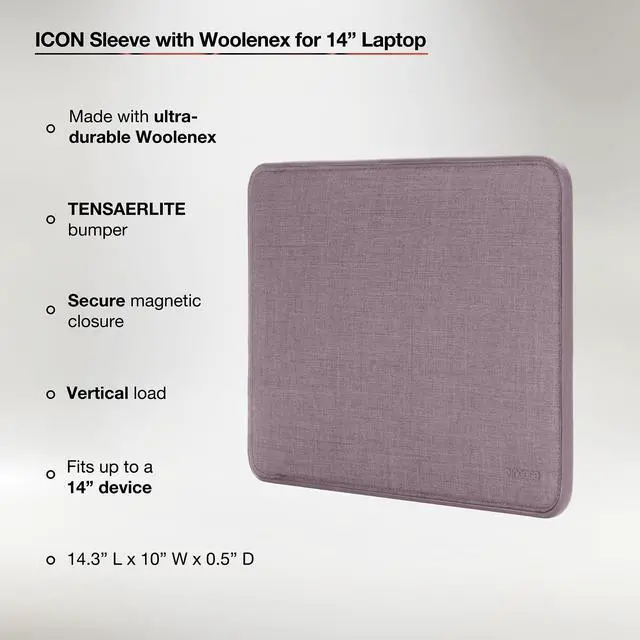 MacBook Pro 14" models: A3434, A3112, A3185, A3401, A2918, A2992, A2779, A2442. M5, M4 Max, M4 Pro, M4, M3 Max, M3 Pro, M3, M2 Max, M2 Pro, M1 Pro, M1 Max Chip with Liquid Retina XDR Display & Touch ID ^^ Limitless Protection - Carefully protect your MacBook with this 14 inch laptop sleeve equipped with shock-absorbing bumpers, long-lasting Woolenex exterior and soft, faux-fur-lined interior for maximum impact protection during transport. ^^ Convenience In Mind - Designed to go where you go, seamlessly store and easily access your computer with our slender laptop carrying case featuring a secure magnetic closure that prevents unwanted slips and keeps out dust and debris. ^^ Sleek & Sophisticated - The ICON laptop carrier offers a polished finish with side MacBook protection and strong exterior that retains form over consistent extended wear. ^^ The Incase Way - Created with the modern user in mind, while following the Incase way, our MacBook computer sleeve focuses on the merge of style and functionality making this the perfect product for students and professionals alike.