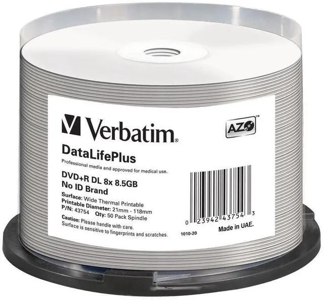 Announcing availability of Thermal Printable DataLifePlus 8X speed DVD+R recordable discs. With a vibrant white surface and supporting full-surface edge-to-edge printing, Verbatim 8X Thermal Printable DVD+R media are fully compatible thermal disc printers from Prism and Everest. The discs do not have a stack ring", enabling maximum print coverage over the surface and superior overall printing performance results in crisp, clear graphic and text reproduction. Verbatim DataLifePlus Thermal Printable 8X DVD+R discs are qualified for use with high-speed DVD writers from HP, and Sony. DataLifePlus White Thermal Hub Printable DVD+R discs are based on an advanced Metal Azo recording dye, which provides the highest level of performance, reliability, and archival life.
