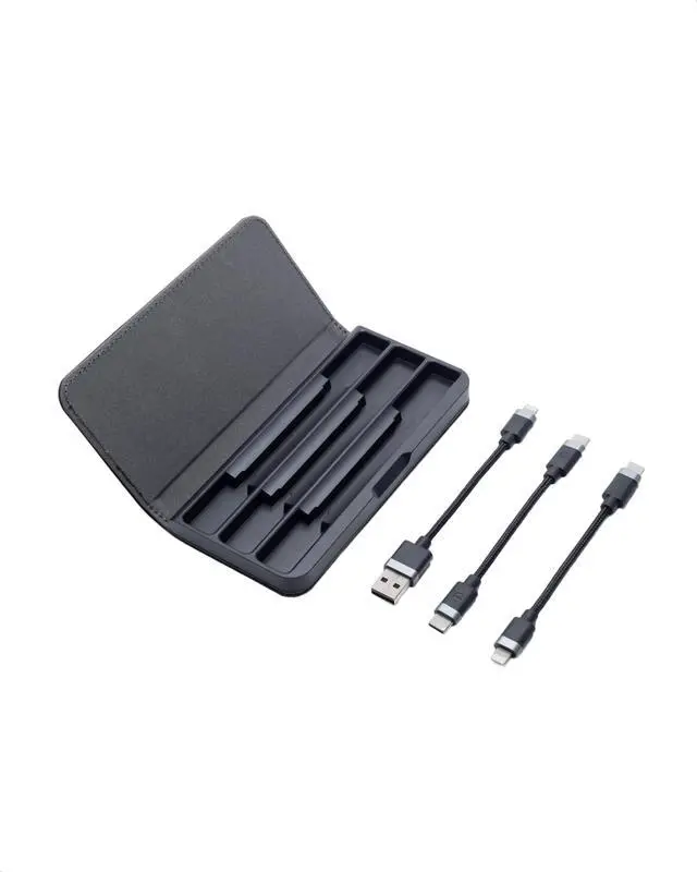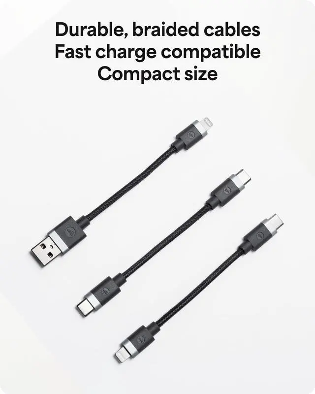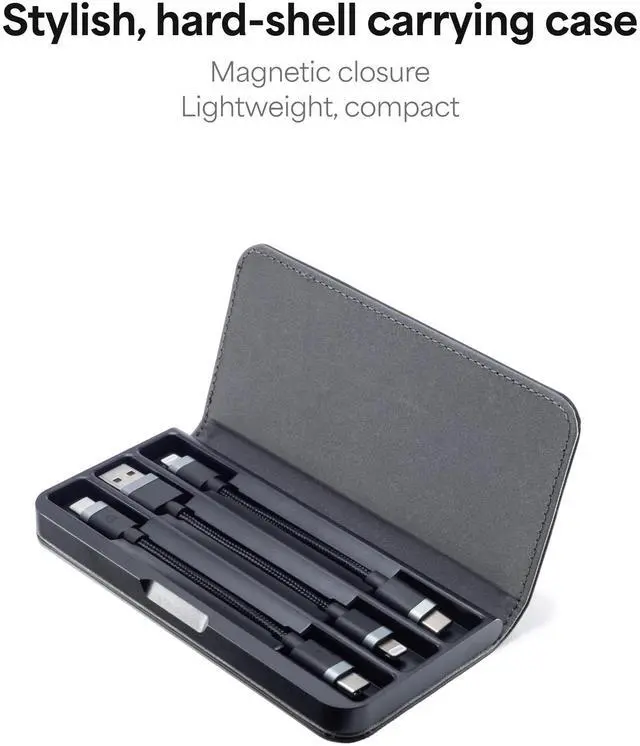Key Features: Includes USB-A to Lightning, USB-C to Lightning, USB-C to USB-C Fast charge compatible for iPhone, iPad, and Android devices Durable braided cables designed to resist wear and fray Compact 5-inch cable length for clean, efficient connections Stylish hard-shell carrying case with magnetic closure Compatible with Apple and Android devices