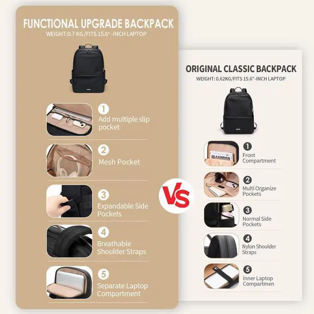 Spacious and Organized - This new upgrade women backpack preserves its original features while enhancing the details. The added bonus is a separate laptop compartment that can be adapted to a 15.6 inch laptop. We also have the extensibility of the lateral pockets. It's not that big, but it offers enough space for everything you need.
