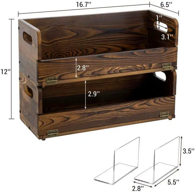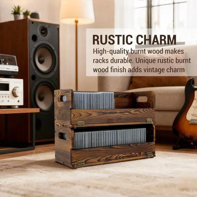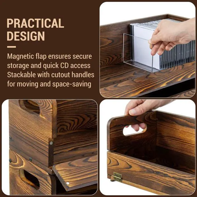 Rustic Burnt Wood Design Made from solid wood with a warm burnt finish, these CD holder racks bring a touch of vintage charm to any home or office decor ^^ Front Magnetic Flap Door Easy-access front flap features a magnetic closure to keep contents neatly concealed while adding a clean, seamless look to the design ^^ Stackable with Cutout Handles Designed to be stackable for space-saving vertical storage; side cutout handles make lifting and transporting each box easy and convenient ^^ Versatile Media Storage Each box holds standard-size CDs and can also be used to organize DVDs, video games, or small accessories on shelves, desks, or entertainment consoles ^^