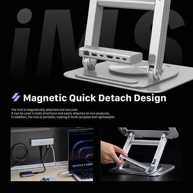 Intelligent Magnetic System (iMS) features an easy-to-remove magnetic hub system and cellphone stand, offering versatility for home use or on the go. The stand can expand, with the height extending from 53mm to 420mm. Specially designed for MacBooks, the Hub Stand Ultra combines an adjustable stand with USB-C hub functions for comfort and convenience. ^^ Built-in USB-C Host, USB-C PD port, HDMI port, USB-A port ( USB-A 3.2 Gen2 10Gbps), USB-C Data port ( USB-C 3.2 Gen2 10Gbps), and RJ-45 networking port meet all your charging, video, and data transfer need, It also supports super-crisp 4K@60Hz resolution and HDCP 1.4 encoding for flawless video streaming from Netflix, Apple TV, and more.