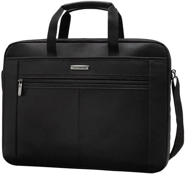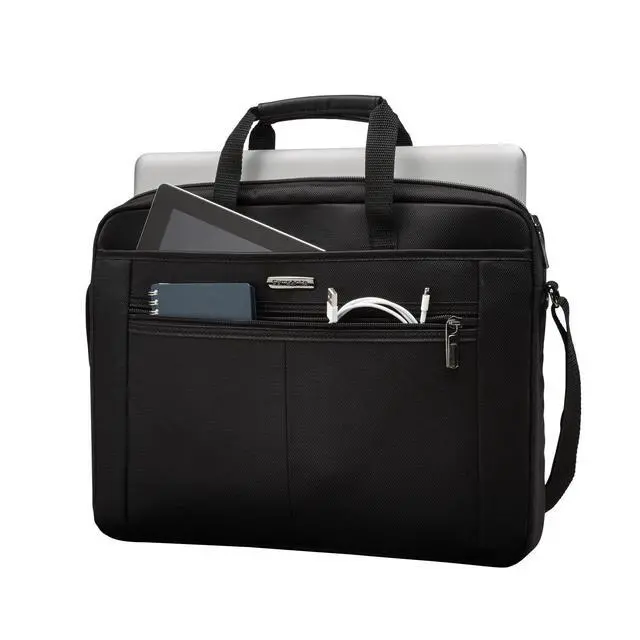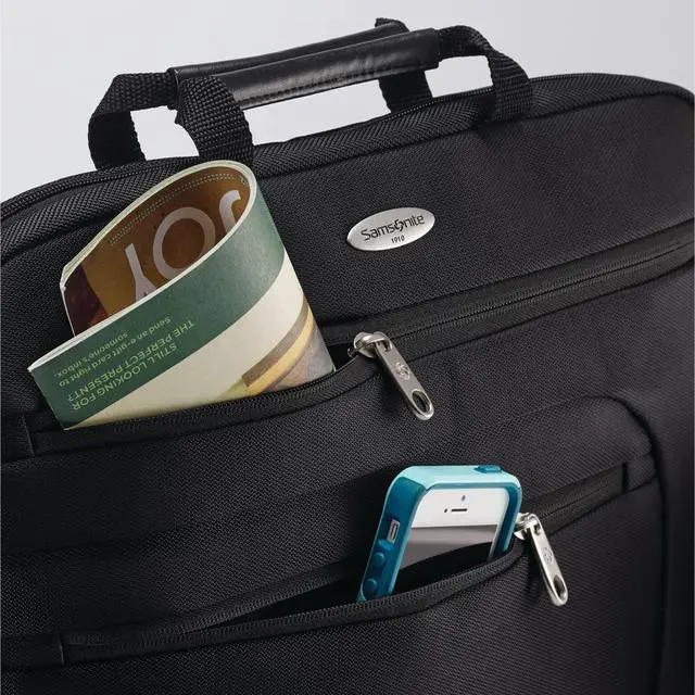 Padded main compartment keeps laptop secure plenty of pockets to hold essentials and accessories. Easy access to front and rear zipper pockets. Zip-top closure keeps contents secure. Rear exterior strap fits over most upright luggage handles. Removable, adjustable and padded ergonomic shoulder strap makes toting comfortable.