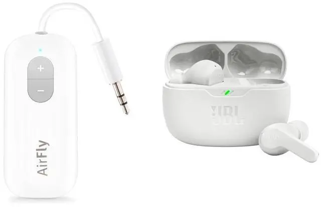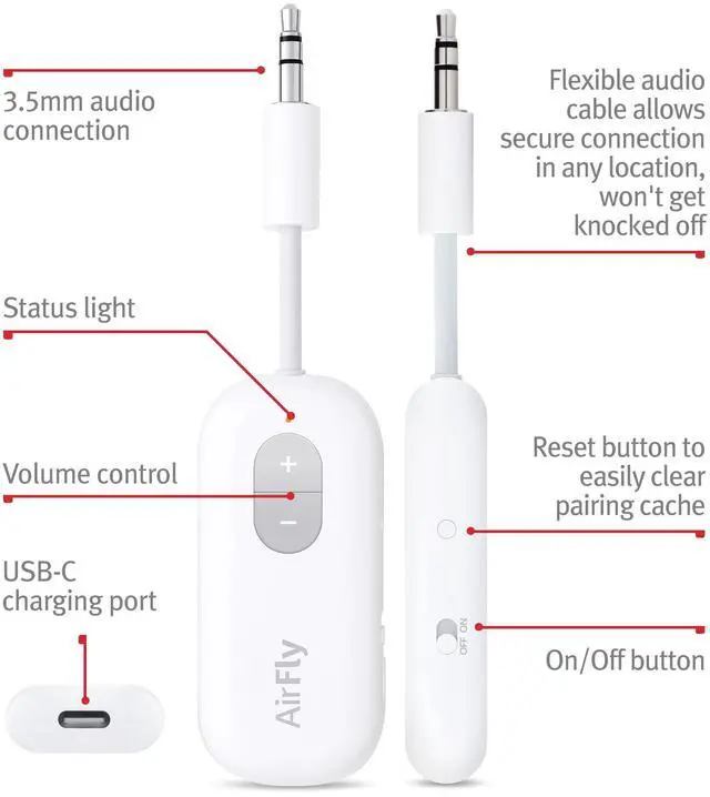 AirFly bluetooth audio transmitter lets you stream wireless audio to your AirPods or other bluetooth headphones from devices that do not have built-in Bluetooth, such as in-flight entertainment systems on airplanes, gym equipment in fitness centers and anywhere else with only wired headphone jacks. Simply plug AirFly into the headphone jack on an airplane seat or treadmill at the gym to listen movies or shows with your AirPods. Its that easy. AirFly stays charged for over 20 hours (much longer than the competition so you won't run out of battery in the middle of a long flight) and includes a USB charging cable and travel pouch.