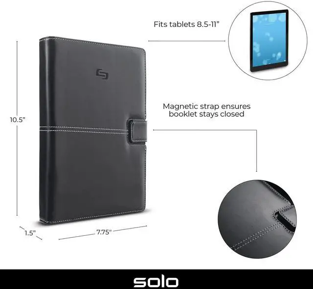 Features: -Swivel mount back for portrait or landscape view. -Unique rear design offers enhanced leverage when viewing at multiple angles. -6" Universal fit technology adjusts to accommodate tablets or eReaders from 5.5" to 8.5". - 8.3" Universal fit technology adjusts to accommodate tablets or eReaders from 8.5" to 11". -Magnetic strap ensures the booklet stays closed and tucks away to not obstruct screen view when in use.
