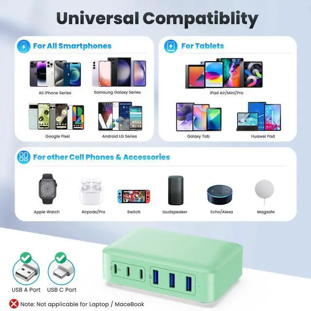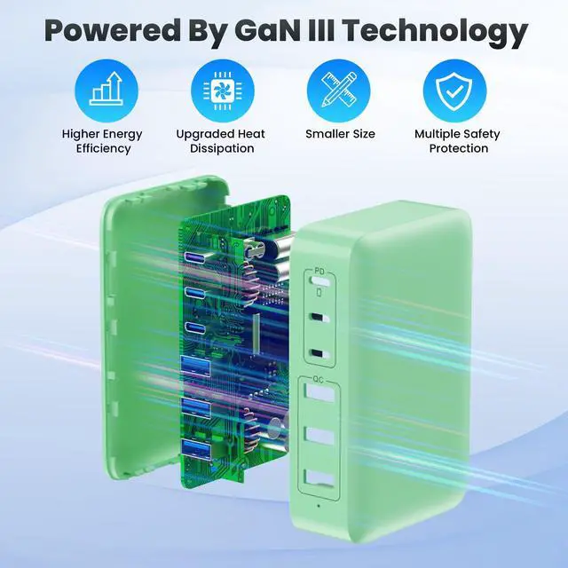 GKUTW USB C Charger Block, GaN III 8-Port USB C Fast Charging Station PPS PD 65W Laptop Charger Adapter Compatible with MacBook Pro/Air,DELL,HP Surface,iPhone 15/Pro/14/13,Galaxy S23,Light Green
