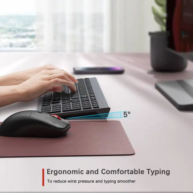 [(Quiet and Comfortable Typing)] Noiseless keyboard and mouse wireless provide whisper quiet typing and clicking, with responsive (2mm stroke length), silky smooth keys, low-profile keys and silent click buttons for a more pleasant typing experience, so you no longer have to worry about disturbing others when working at home. With ergonomic designs key caps, more smooth typing, comfortable typing in the office or at home.