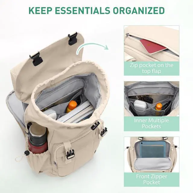 Spacious and Smart Organisation: Travel backpack for women with a total of 5 compartments, you can organise your belongings well. A main laptop compartment holds up to a 15.6inch notebook; 2 front zip pockets provide separate spaces for pens, keys, wallet, books, clothes, etc.; and there is a water bottle pocket on each side for drinks bottles and umbrellas