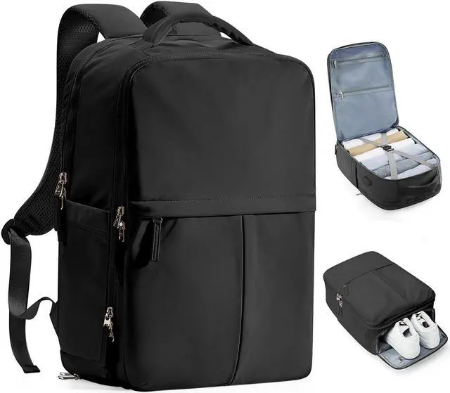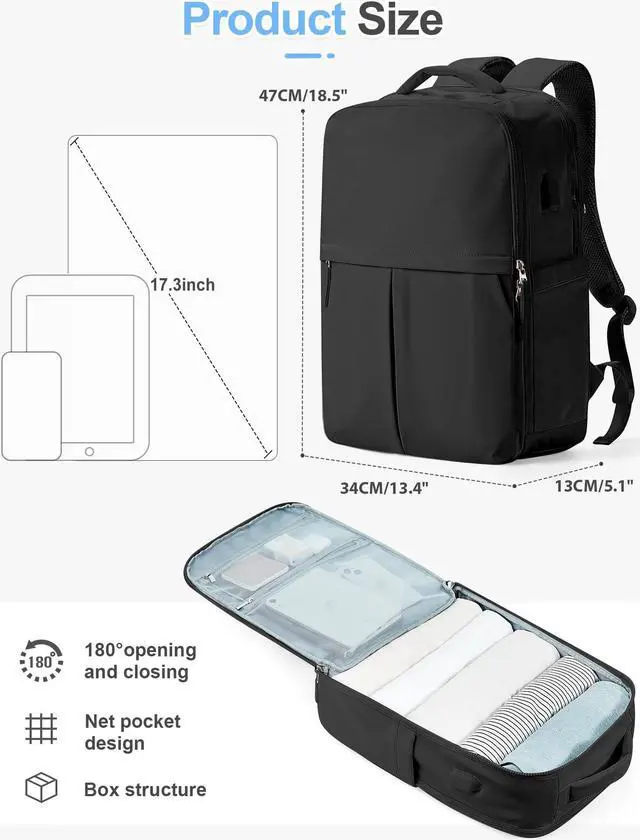 LUGGAGE STRUCTURE DESIGN: With a 180-degree opening and closing design, the main pocket of this carry on backpack for men boasts a large capacity, making it easy to put in and take out items. Inside the main pocket are: mesh pockets*2, and luggage securing straps. And this travel backpack also has a shoe compartment and a wet items pocket. So you can use this travel backpack as a small suitcase.