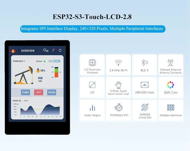 • ESP32-S3 2.8inch Display Development Board, with 2.4GHz WiFi and Bluetooth BLE 5 support, integrates high-capacity Flash and PSRAM. Onboard 2.8inch LCD screen can smoothly run GUI programs such as LVGL. Combined with various peripheral interfaces, suitable for the quick development of the HMI and other ESP32-S3 applications.