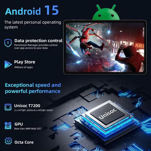 2025 Latest Tablet - The T5 Pad is powered by the latest 64-bit Android 15 operating system, bringing faster boot times and response times with more customization, privacy, and security options, and comes pre-installed only with the Google Play Store, no bloatware apps