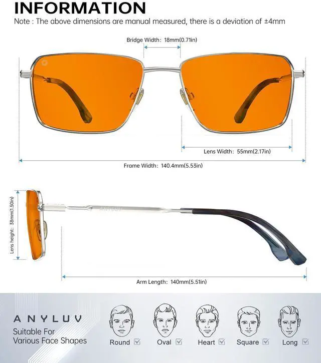 LIGHTWEIGHT & ALL-DAY COMFORT: ANYLUV Blue light glasses Crafted by Metal frames and flexible hinges, These blue light glasses for men provide a snug, pressure-free fit. Soft silicone nose pads prevent slipping, making them ideal for extended screen time at work, gaming marathons, or nighttime driving.