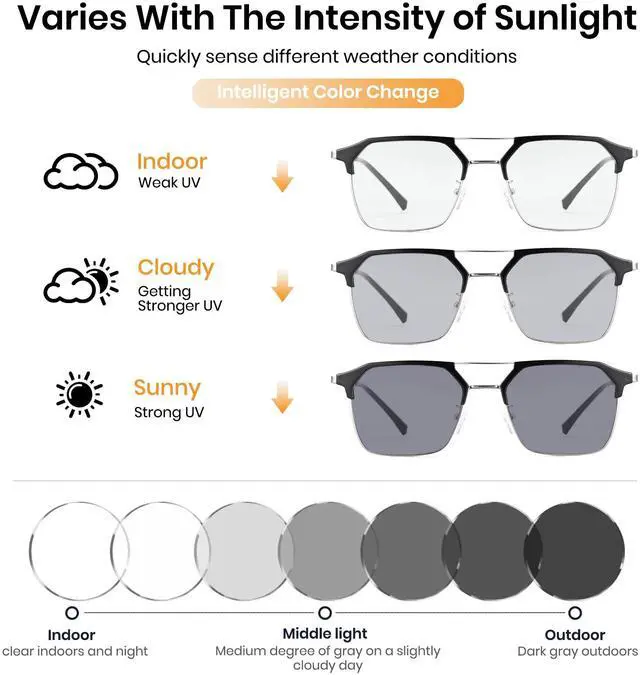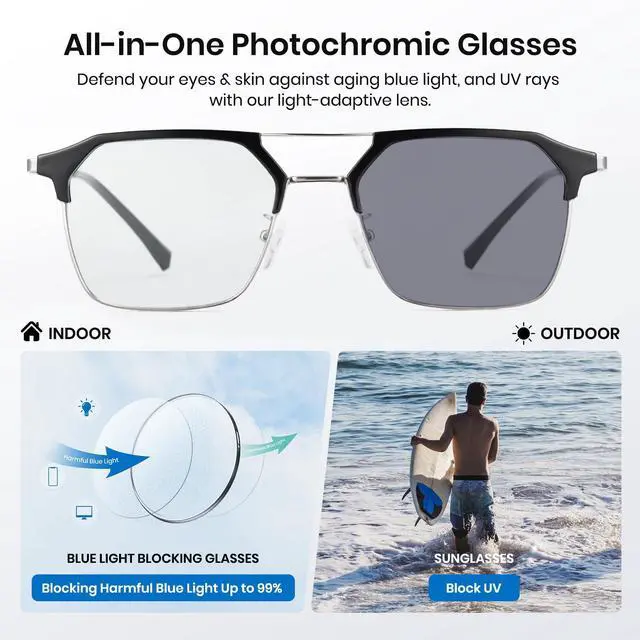 Photochromic Lenses for Any Light: Smart lenses automatically adjust to changing light conditions, ensuring clear vision indoors and outdoors while reducing eye strain