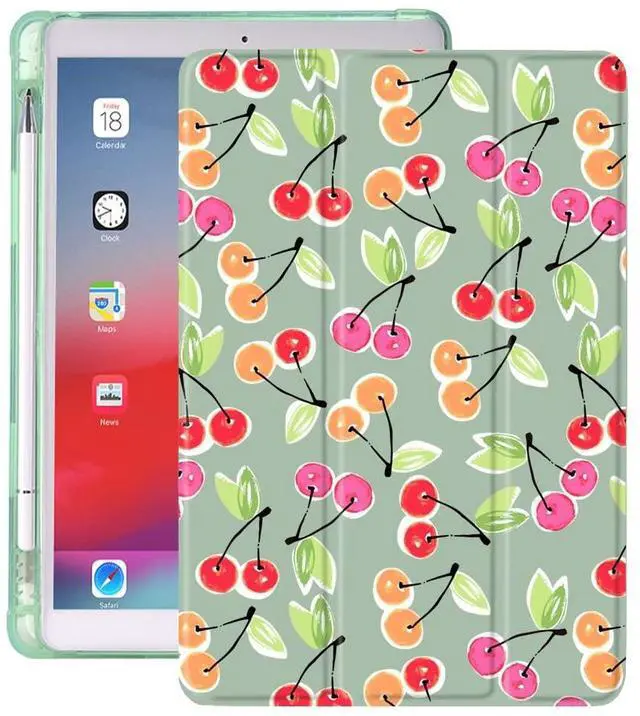 Idocolors Cherry Pad Green Case for iPad 7th/8th/9th Generation ( 10.2 Inch 2019/2020/2021) Cute Girly Anti-Scratch Shockproof With Pencil Holder Lightweight Smart Trifold Stand
