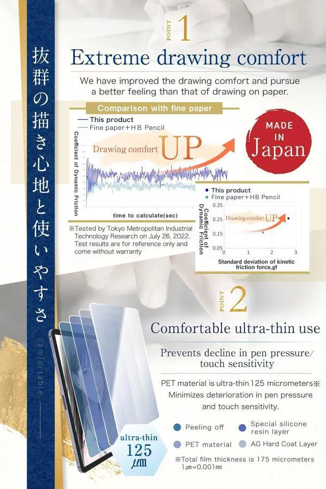 [(Comfort in Ultra-Thin Design)] The PET layer of the film is ultra-thin, measuring only 0.125 micrometers in thickness. This design minimizes any decrease in stylus pressure sensitivity or touch responsiveness, ensuring compatibility with both the 1st and 2nd generation of Apple Pencil.