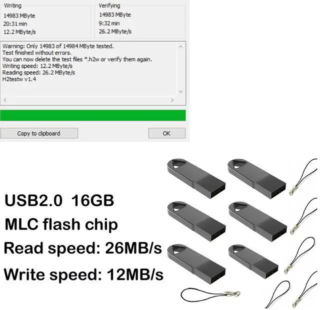 16GB USB Flash Drive 50 Pack, thumb Drives Bulk: Read speed: 26MB/s; Write speed: 12MB/s, with a better MLC flash chip, passed H2 software test.
