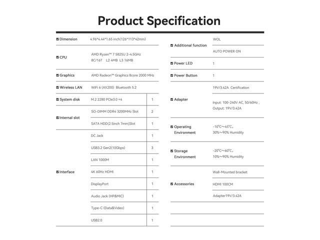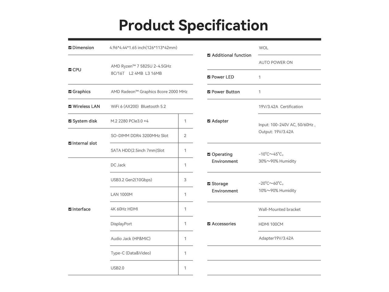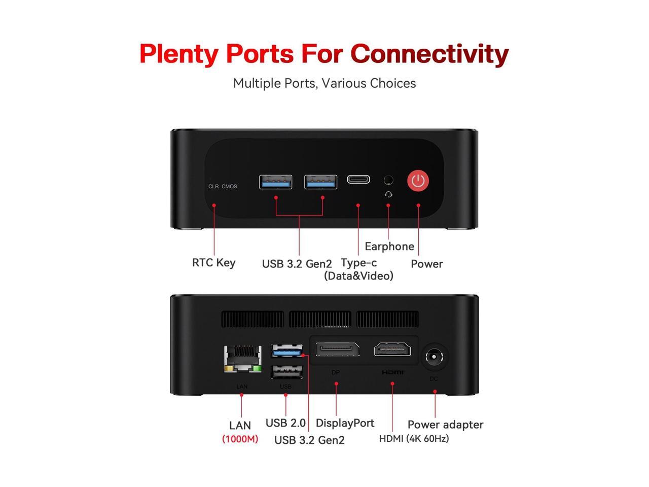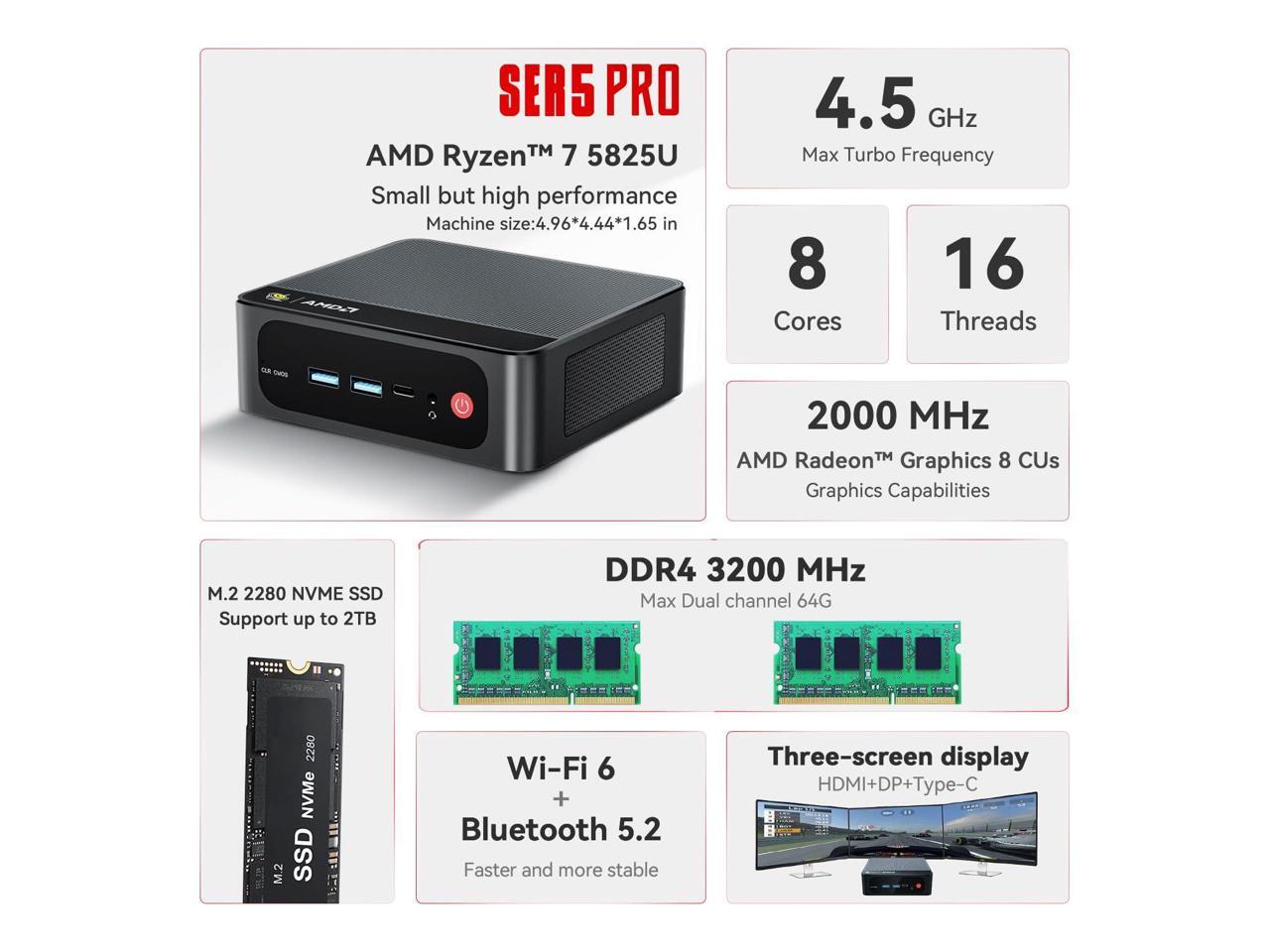 • [(Compact & Rich Interface)] Easy to setup and small in size. WiFi 6 (802.11ax) + Bluetooth 5.2 is faster and more stable. Gigabit Ethernet RJ45 1000M network connectivity. Beelink SER5 mini computer is equipped with 1x type-C, 1x HDMI, 1x DP), 3x USB3.2 Gen2(10Gbps), 1x USB 2.0, 1 xGigabit Ethernet, 3.5mm Audio Jack. 2 copper tubes and fans design also help this mini pc works better and efficient heat dissipation. It can be fixed on the back of the monitor to save your workstation.