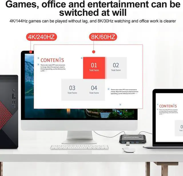 • Displayport kvm Switch 1 Monitors 2 Computers 165hz :Recommend resolution 5120x1440@60Hz, 5120x1440@120Hz,5120x1440@144Hz,5120x1440@165Hz,3440x1440@75Hz,3440x1440@100Hz,3440x1440@144Hz,3440x1440@165Hz,3440x1440@175Hz,7680x4320@60Hz ,3840*2160@60Hz,3840x2160@144hz,3840x2160@175hz,3840x2160@240Hz ,2560*1440@165Hz,2560*1440@144Hz,3840x1600@144Hz,3840x1600@165Hz,3840*1620@144Hz,3440*1600@144Hz,3840*1080@240Hz,and the lower resolution is not recommended . Drive-free for Windows 10/7/2000/XP/Vista, Linux, Mac